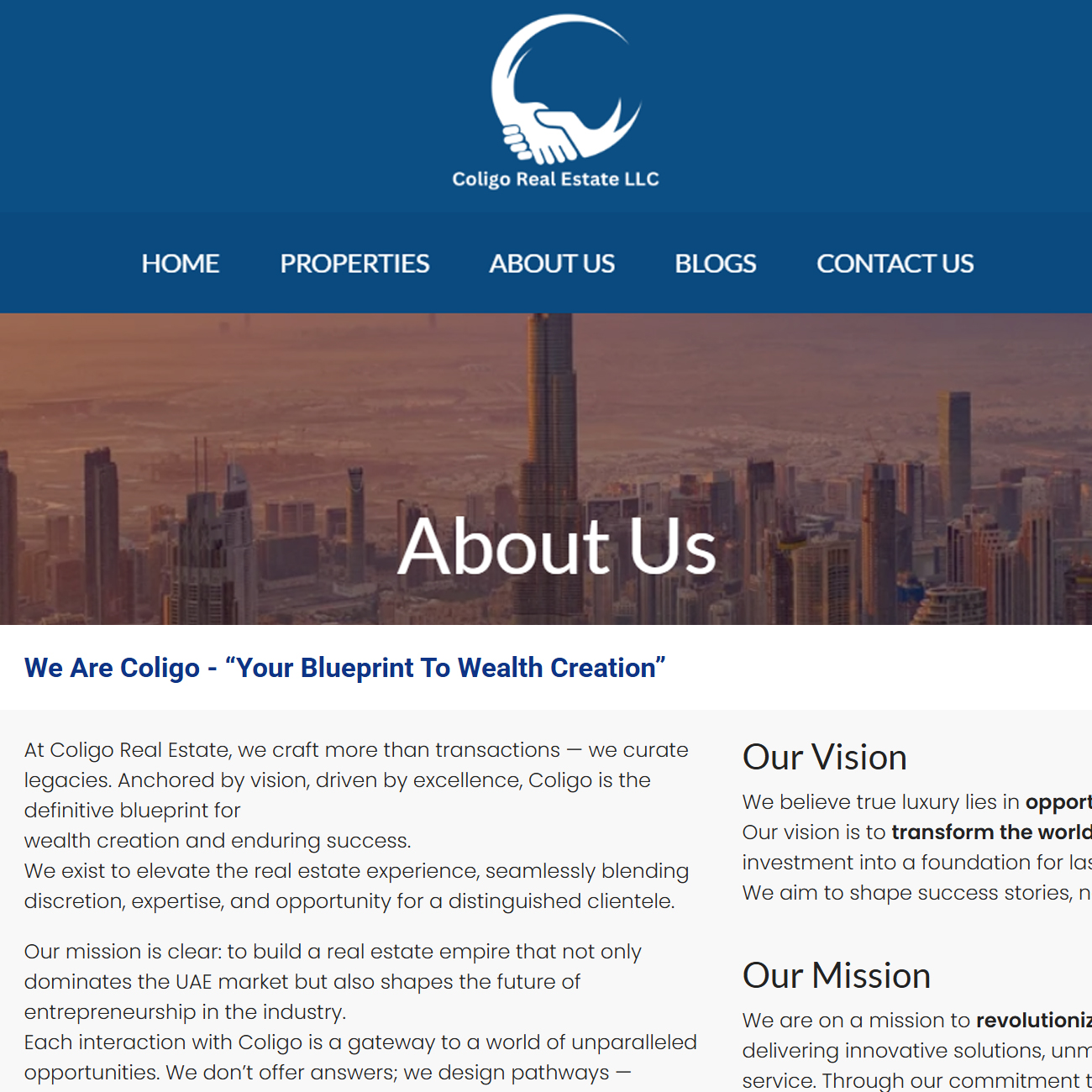 We delivered the official corporate website for Coligo Real Estate, a Dubai-based luxury real estate advisory and investment services firm. The primary goal was to establish a refined digital platform that reflects Coligo’s commitment to bespoke property investment guidance, high-end market expertise, and personalized client engagement. coligo.ae