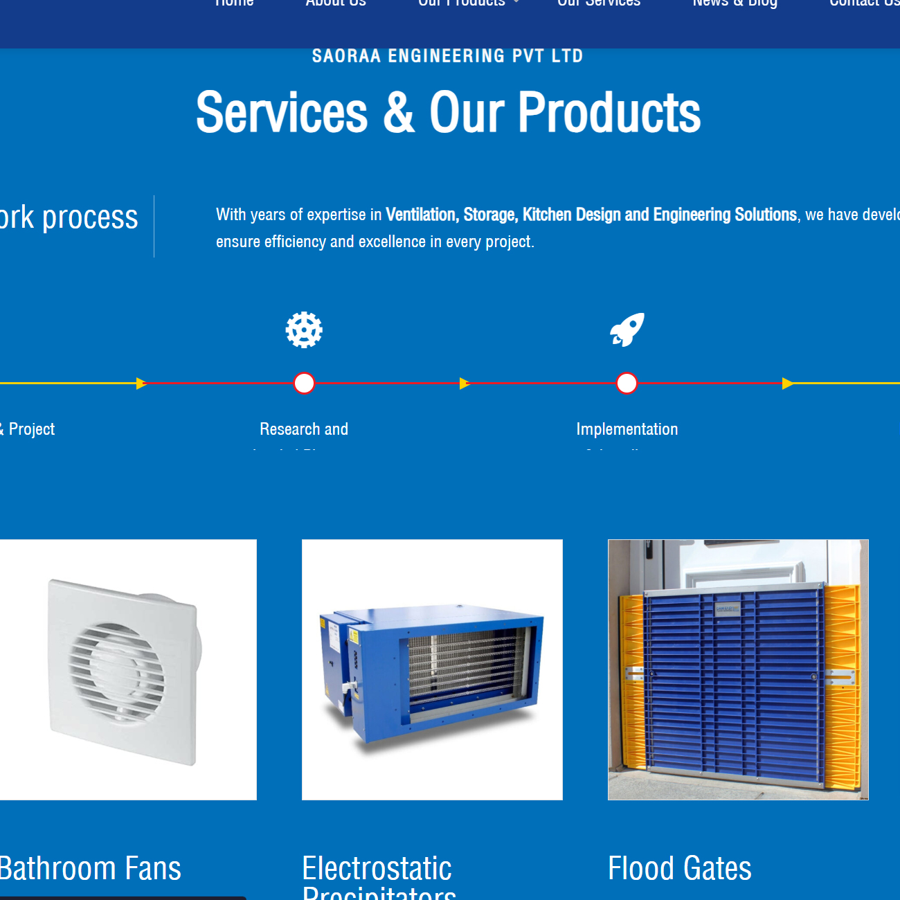 The site features a structured layout that highlights Saoraa Engineering’s core competencies in ventilation systems, air purification, HVLS and industrial fans, kitchen ventilation, storage and racking solutions, and negative pressure systems. Navigation is intuitive, allowing visitors to explore detailed product and service categories while maintaining clarity and brand cohesion.